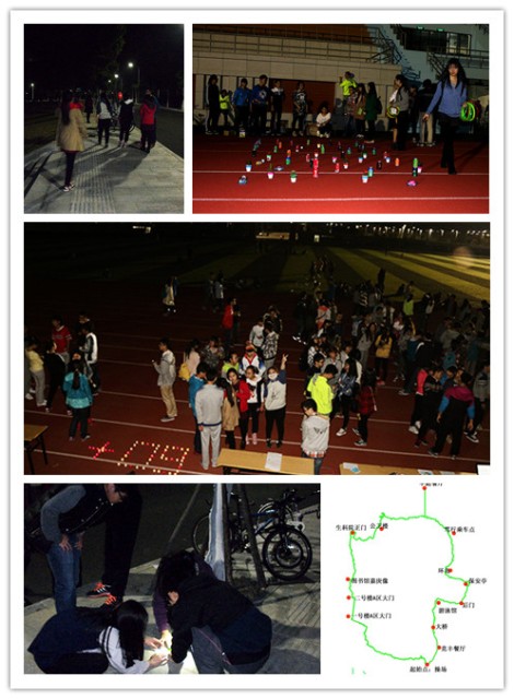 此次“地球一小时”系列活动另一重要组成部分就是由绿野协会和蔚蓝社共同承办的“趣味马拉松闯关竞赛”。共32组选手参赛,每组4-6人。选手须环校一周,且沿途经历14个关卡。对很多选手来说,这是他们第一次在夜色中跑趣味马拉松。19:50,比赛于田径场开始,各组选手凭借手中地图先后向标定地点进发。同时各关卡志愿者也已就位,他们将指导选手闯关。各关卡都有红灯笼作为指引。一期食堂前,选手玩起了“你画我猜”的游戏。游泳馆前大桥上,选手玩的是猜拳。此外,“默契报数”考验选手们的默契程度。保安亭前的“能源知识我知道”既检验着选手们对能源知识的了解程度,又不忘引起选手对环保的关注。二号楼的“奇妙夜”步步惊心,在黑暗的二号楼寻找荧光棒。期间各组选手在夜色中满头大汗匆忙从一个关卡跑向下一个关卡,一路不时有同伴的鼓劲加油声。