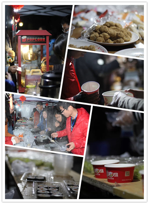 “青春之夜”同样是吃货们幸福的一夜。快食区的爆米花、麻糍、南瓜饼、鸭脖、寿司、奶茶以及其他零食早已让人垂涎三尺;慢食区的汤圆、水饺、烧烤、炸鸡也毫不逊色。而冒着热气的姜汤,则整晚不间断地免费提供给现场的观众。