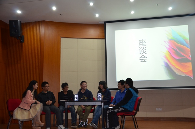 介绍完团队以及与比赛相关的事情后就是在场观众期待已久的“座谈会”互动环节。在队长黄剑兴的带领下现场部分队员上台与主持人以及现场观众互动。互动环节聊得更多的是与同学们息息相关的学习及生活,在座同学积极提问,场上嘉宾也结合自身实际一一给出建议,现场气氛显得更加活跃。在主持人的盛情邀请下E.Taxis队员甚至与现场观众玩起了“你比我猜”的游戏,最后在现场观众的热烈掌声中本次科技创业论坛圆满落幕。