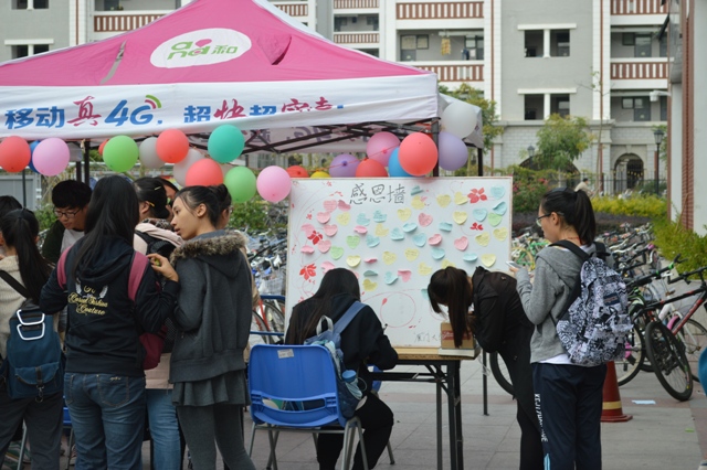 2014年11月26日至27日,在感恩节到来之际,校区学生会联合八院学生会为老师们送上了祝福卡片。本次活动由厦门大学翔安校区团工委主办,在竞丰食堂门前进行。活动共有两种形式,一是将感恩之情写在工作人员发放的便利贴上,再贴到摊位点的“感恩墙”上;二是把自己的感谢写在发放的明信片或者信纸上,由工作人员统一整理并寄出。
