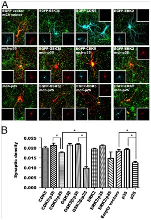 GSK3β:P25诱导更多的神经元突触退化 近日,厦门大学神经科学研究所张杰教授课题组在国际著名期刊美国科学院院刊(PNAS)以加长全文的形式发表了“CDK5 activator protein p25 preferentially binds and activates GSK3β”的研究论文,张杰教授为该论文的通讯作者。 细胞周期蛋白激酶CKD5和磷酸化糖原合酶激酶3β(GSK3)是在老年痴呆(Alzheimer’s disease)疾病发生发展过程中十分重要的两个蛋白激酶。它们都可以诱导Tau蛋白的过度磷酸化进而引起Tau纤维缠结并导致神经元凋亡。 但对于CDK5和GSK3这两条通路之间是否存在相互影响一直都不清楚,这也是目前关于AD研究领域中一个十分重要的问题。医学院张杰教授课题组长期从事有关CDK5在AD中的作用机制研究。 该篇论文发现CDK5的激活蛋白P25可以特异地结合并激活GSK3。 在AD的致病过程中,CDK5的前体蛋白P35会被切割成P25, P25会导致CDK5的持续激活并最终诱导Tau蛋白的过度磷酸化或者其他生理过程。张杰教授课题组发现只有P25而非P35可以结合并激活GSK3,并且P25- GSK3 对神经元的损伤作用要大于P25-CDK5。 这一发现有助于对CDK5-P25调控通路的重新认识:在包括AD在内的神经退行性疾病的发生过程中,P35-P25的切割转变很可能主要是通过调节GSK3而不是CDK5来发挥作用的。该项研究成果阐述了AD中CDK5和GSK3之间的全新的相互调控模式,对于预防和治疗AD等疾病提供了新的作用靶点。该论文一经发表就立刻引起了国际学术界AD领域的广泛重视和国内外众多媒体的报道。 本课题是和香港科技大学Karl Herrup教授合作完成的。 由许华曦教授和卜国军教授领导的厦门大学神经科学研究所提供了从分子到动物的一条龙研究平台,同时也从科学软实力上给予年轻教师极大的支持,有效地促进了我院青年教师的科研发展。该篇论文也是继神经所一个多月的时间里在Neuron, Cell Reports, JBC杂志上发表文章以后又一高水平论文。 论文链接:http://www.pnas.org/content/early/2014/10/17/1402627111.long