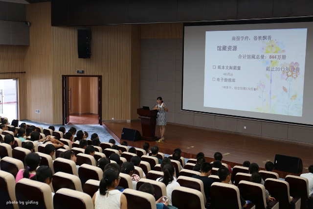 首先是针对各学院2014级新入学本科生和研究生举办的总计16场新生入馆培训。新生培训是同学们初识图书馆的一个重要窗口,学科馆员在精炼概括图书馆的各项服务和设施的同时,以更能与90后甚至95后新生产生共鸣的风趣语言,将一场传统的培训活动变成一次愉快轻松的分享。让大家在笑声和思考中加深对图书馆的了解,也更加明了读书的魅力和意义。