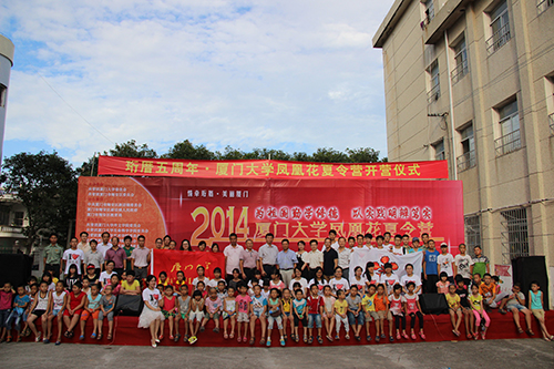 7月25日下午,凤凰花志愿服务团在珩厝小学举行2014年厦门大学凤凰花夏令营开营仪式。翔安区政府副区长林奕田,翔安区团区委副书记邱荣锋,翔安区教育局副局长陈可芳,翔安区新店镇党委副书记叶捷频,共青团翔安区新店镇委员会负责人罗斌,珩厝社区党支部书记王军垦,厦门大学校长助理、翔安校区党工委书记、管委会主任李初环,厦门大学翔安校区党工委副书记、管委会副主任高忠华,厦门大学办公室副主任、翔安校区办主任刘立荣,厦门大学外文学院党委副书记杨云良,厦门大学校团委副书记、翔安校区团工委书记洪海松,厦门大学凤凰花社创社社长、2010-2013年厦门大学凤凰花志愿服务团领队詹伟峰,厦门大学公共卫生学院团委副书记张宇斌,厦门市阳光视线眼镜有限公司总经理蔡金吉等共同参加了开营仪式。仪式由夏令营领队周晓牧主持。
