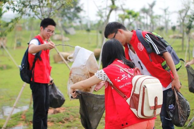 5月25日上午,公共卫生学院“反白游击队”的志愿者们在主楼群四号楼门口集合,在主楼群及周边地带开展垃圾清理活动。