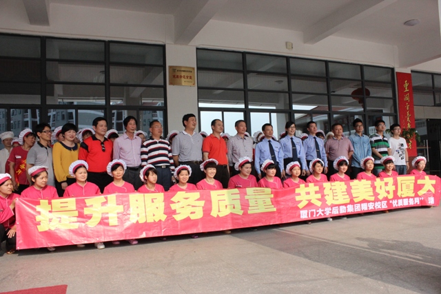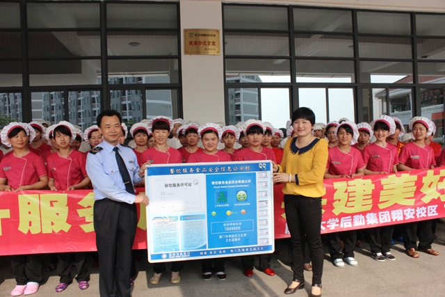 2014年4月18日下午3:30,后勤集团、翔安校区餐饮服务部工作人员、竞丰餐厅全体员工迎来“优质服务月”最亮眼的肯定——“食品卫生量化管理A级单位”授牌仪式在竞丰餐厅举行。翔安区卫生局卫生监督所副所长邱镜椿,校区资产办主任吴福武,集团副总经理郑庆喜、刘君彬,总经理助理、翔安校区服务办主任王裕民等莅临授牌仪式现场。
