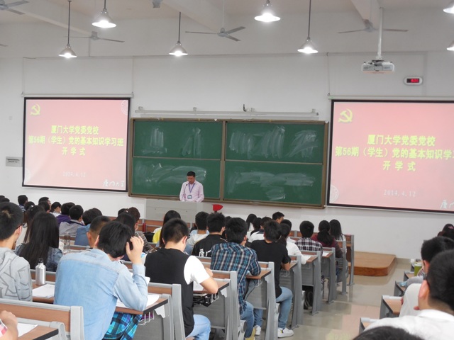 4月12日上午,党委党校第56期党的基本知识学习班(翔安校区)开班仪式在1号楼A401教室隆重举行。校党委党校副校长、统战部部长梁卫中,组织部副部长廖志丹,以及翔安校区各学院带队教师和入党积极分子共192人参加。仪式由生命科学学院党委副书记左正宏主持。