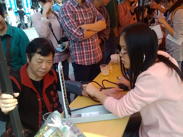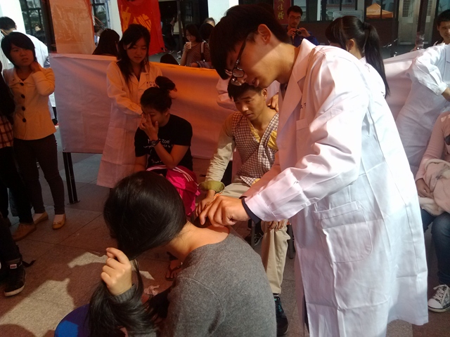 为前来参加活动的师生提供义诊服务是本次活动的主要内容。中医药协会准备了血压仪等设备,在活动现场为同学们测量血压,解释血压测量数值的含义。燕来福中医诊所的吕小玲医师和姚帅医师应邀在现场坐诊,让到场的同学们都体验了一次细致而专业的“户外中医诊察”。针灸推拿协会则在活动现场为同学们做刮痧、针灸及耳贴治疗。义诊活动吸引了大批同学参加,大家热情高涨。同学们对中医的辩证论治、刮痧、针灸、耳贴诊治等中医学理论知识和诊疗方法都抱有强烈的好奇心和求知欲,认为这是中医学的迷人之处。