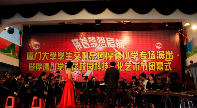 11月19日下午,我校学生交响乐团厚德小学专场演出暨南安市厚德小学首届校园科技文化艺术节闭幕式在泉州南安市厚德小学举行。我校翔安校区团工委书记洪海松及厚德小学的领导和师生们一起观看了演出。