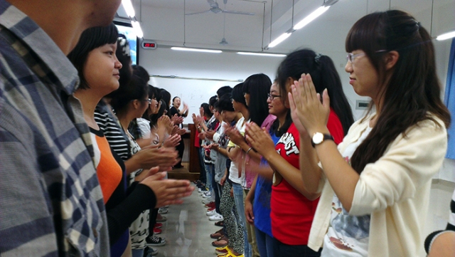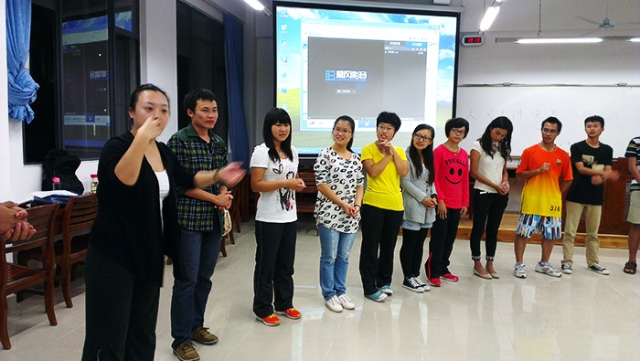 讲座的开始,李老师让大家手牵手围成一个圈,闭眼聆听感受让围成的圈更圆一些。由此讲座的第一部分“音乐诉诸于听觉”在风扇声、轻缓移动的脚步声中展开。第一次的正式练习——恒拍传递,从感受每个人自己的脉搏速度开始,由慢速循序渐进,围成一圈的每一个同学一个接一个将老师手掌击出的拍子传递下去。高低起伏的击掌声速率稳定的回环着,老师由此引出“恒拍”的概念,让同学们在动起来的过程中,切身体会节奏和聆听在音乐中所起到的重要作用。