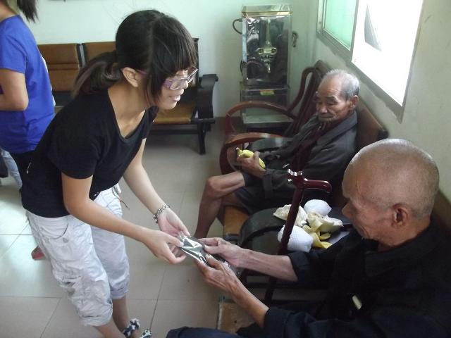 到达敬老院之后,志愿者们在管理员的帮助之下将各位老人请到了活动室,并贴心地为他们送上香蕉、柿子和剥好皮的柚子。安顿好老人之后,志愿者用闽南语做了简短的自我介绍并送上棉袜作为节日礼物。随后,志愿者们纷纷展示才艺,歌曲、舞蹈、乐器演奏,一个个简单而不失精彩的表演让老人们舒展开了笑颜,也赢得了他们的阵阵掌声。志愿者们还坐到老人中间,和他们攀谈起来,倾听他们的想法,也耐心地回答他们关心的问题。会闽南语的同学还为不会讲闽南语的同学做起了翻译,以便顺畅地交流。值得一提的是,为了避免一位腿脚不方便的老人受到冷落,两名志愿者主动要求去她的房间陪她打牌。活动在一片融洽的氛围中圆满结束,临走之前,志愿者们还贴心地清理了活动产生的果壳等垃圾,体现了环生学子良好的道德风尚。