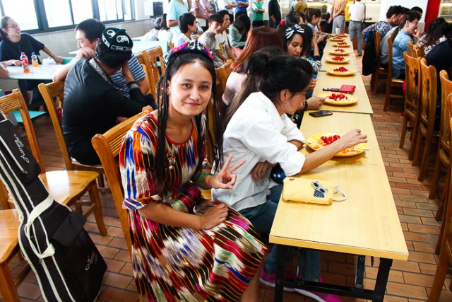 食堂随处可见身着民族特色服饰的同学,他们讲着本民族的语言,彼此祝福。一位维吾尔族的姑娘向记者展示了她精心编起的长发,说今天早上足足编了三个小时才完成,就为了可以美美地参加活动。