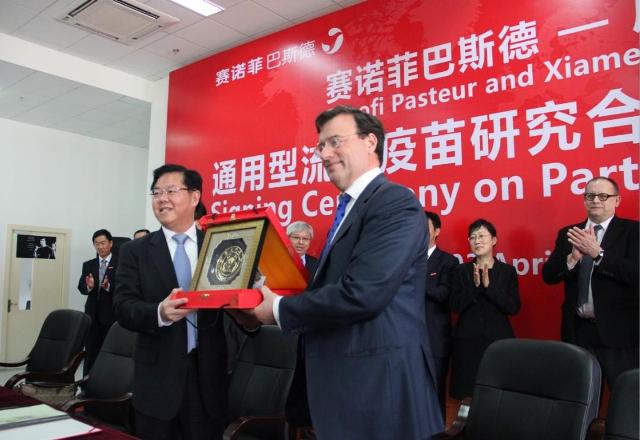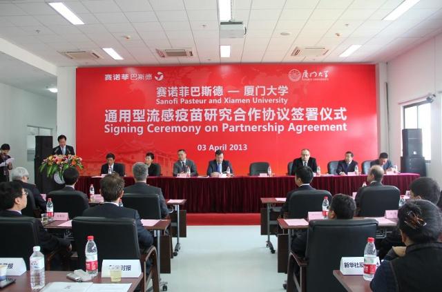 作为我校92周年校庆系列活动之一,当天的协议签署仪式朴素却不失隆重。校长朱崇实在仪式上说,此次合作不仅是具有里程碑意义的中法两国之间的一次科学界的重要合作,更是中法两国共同造福世界、造福人类的一个善举。赛诺菲巴斯德公司总裁兼首席执行官夏立维高度评价了国家传染病诊断试剂与疫苗工程技术研究中心近年来的研究成果,并表示,公司在全球选择合作伙伴时,首先考虑的是对方的科研是否足够优秀,这也正是该公司“千挑万选”看中厦大的原因。我校副校长叶世满和赛诺菲巴斯德公司高级副总裁、全球研发负责人韦德博士代表双方签署了协议。