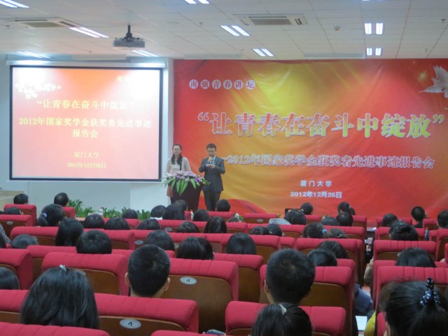 青春,在奋斗中绽放。为引导广大学生从优秀同学身上学习到坚定的理想信念、严谨的学习态度,以及自强不息、拼搏奋斗、乐于奉献的精神,2012年12月26日晚7点,由厦门大学党委宣传部、学生工作部和团委联合举办的厦门大学2012年国家奖学金获得者先进事迹报告会在厦门大学翔安校区环境与生态学院B-103报告厅展开。