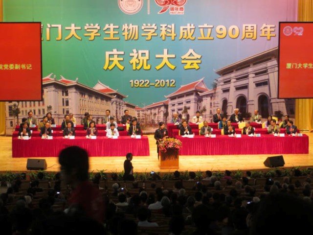1922年,校主陈嘉庚先生在厦门大学亲自设立的动物学科植物学科,直至今日,厦门大学生物学科已走过了90年风雨。20121216日上午10时,厦门大学生物学科成立90周年庆祝大会在厦门大学科学艺术中心隆重举行。厦门大学党委书记杨振斌,台湾长庚大学副校长陈君侃,中国科学院院士、福建省农科院研究员谢华安,中国科学院院士唐崇惕教授,厦门大学党委副书记、纪委书记赖虹凯,副校长詹心丽,党委原副书记陈力文,校长助理贺祖斌及地方政府相关部门领导、各兄弟院校代表、校友代表,生命科学学院教师和学生代表共800余人出席了庆祝大会。此次庆祝大会收到了来自各方的贺信与题写贺词。
