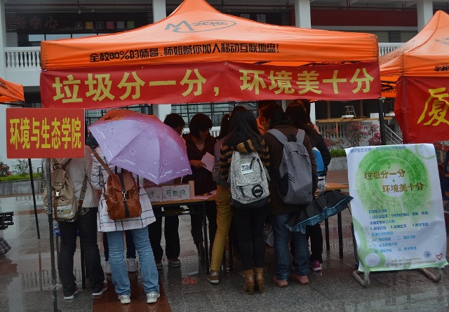 2012年12月5日中午,由环境与生态学院团委主办、环境与生态学院青年志愿者协会承办的“垃圾分一分,环境美十分”垃圾分类宣传活动在翔安校区竞丰食堂前的广场顺利进行。环境与生态学院青协旨在通过实际行动向同学们宣传垃圾分类的相关知识,既响应了党的十八大报告中对“大力推进生态文明建设”的号召,在校园里宣传环保意识、推进生态文明建设,也在12·5国际志愿者日期间宣扬了志愿精神。