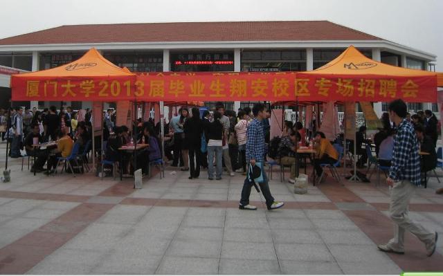 11月23日下午,厦门大学2013届毕业生翔安校区专场招聘会在翔安校区竞丰食堂前举行,本次招聘会是我校在翔安校区举办的首场综合性招聘会。现场共21家用人单位参会,包括中国矿业大学、三峡大学、福建省宁德市医院、晋江市卫生局、中国人民解放军第一七四医院/厦门大学附属成功医院、厦门大学附属第一医院同民分院/厦门市翔安区同民医院、厦门莲花医院、福建广生堂药业股份有限公司、厦门北大之路生物工程有限公司、厦门艾德生物医药科技有限公司、厦门鹭燕药业有限公司、江苏正大天晴药业股份有限公司、上海锅炉厂有限公司等多家单位,涉及生物、能源、医学、药学、环境工程等翔安校区相关专业,吸引近500名毕业生进场应聘。