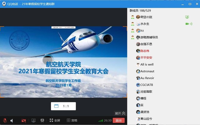 2021年寒假来临,根据学校发布的《关于做好2021年寒假春节期间新冠肺炎疫情防控工作的通知》《关于做好2021年寒假期间相关工作的通知》《学生错峰离返校和假期健康管理工作安排》《关于做好2021年寒假期间学生公寓相关工作安排的通知》等文件精神,结合学院2021年寒假留校学生实际情况,航空航天学院学工组紧张有序开展学生离校留校相关工作,并于1月15日线上召开留校学生安全教育大会。会议由学院团委副书记水永生主持,学院全体辅导员和留校学生参加会议。