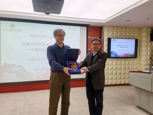 1月14日下午,中国海洋大学宋微波院士做客厦门大学环境与生态学院,并为我校师生带来题为“进展中的纤毛虫学研究:一个微观世界的窗口”的南强学术讲座。 “南强学术讲座”是厦门大学最高级别的学术讲座,报告人均享有极高的学术声誉,讲座自2002年起设立,本期为第1060期。