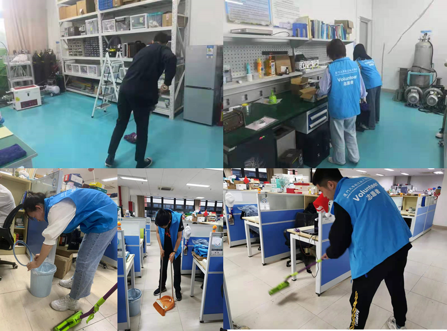 院楼实验室和学生工作区是老师和同学们日常学习、科研和工作的重要场所,保持环境卫生的整洁具有重要意义。学院学生机构发动同学们和志愿者对院楼实验室、工作区和公共区域进行了清扫整洁工作。考虑到院楼内师生的日常使用情况,清洁工作分时段、分批次进行,灵活组织安排。活动由学生骨干带头,通过唤醒身边同学的劳动意识,调动同学们参与清扫活动的积极性,与志愿者们一同投入劳动。在一片片热火朝天的氛围中,同学们共同完成了垃圾清扫、实验室安全隐患排查、实验室仪器设备整理、实验工具归置等工作。