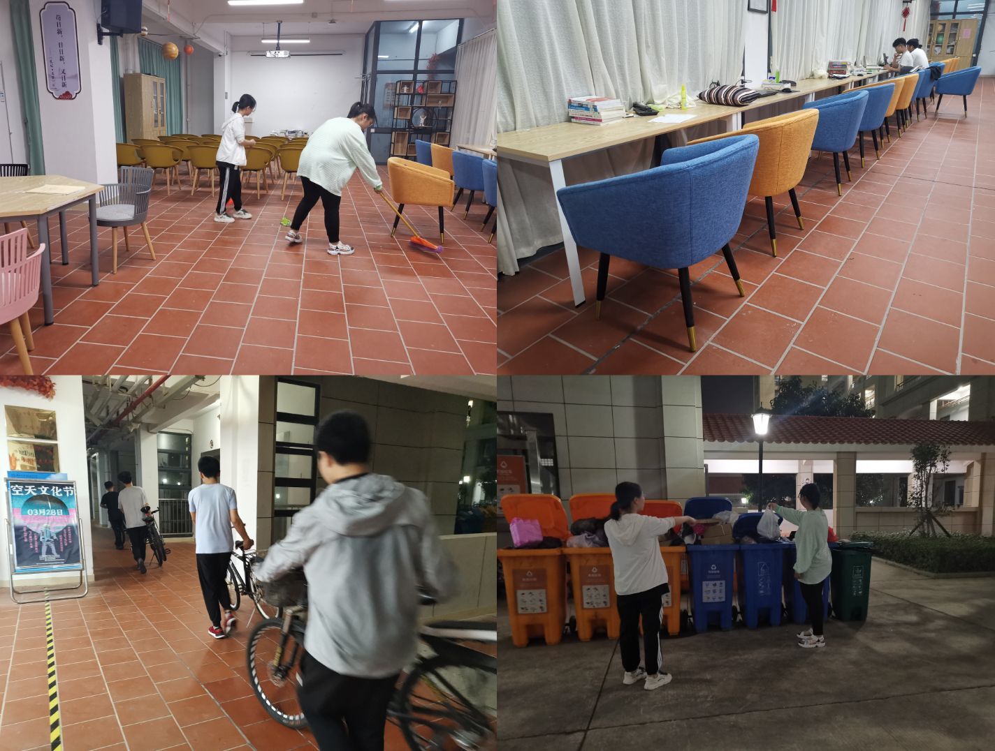 5月1日,学院组织同学们在映雪、博学等“一站式”学生社区开展劳动。考虑到同学们的日常生活需要,针对“一站式”学习空间、架空层单车停放规范进行清洁整理,并对同学们进行垃圾分类宣传引导。映雪五“一站式”空间自开放以来备受同学们好评,但使用频率的增加带来了桌椅随意移动、垃圾未及时清理等现象。针对这一情况,志愿者们先后将地面清扫干净、桌面整理有序、展柜摆件整齐、桌椅归位排列,并提醒同学们使用后清理桌面、带走垃圾、摆好桌椅,共同筑造清洁有序的学生活动空间。宿舍楼下单车停放不规范的情况将直接影响同学们的日常出行,甚至造成消防隐患。夜间,由学生骨干带领志愿者们将园区架空层走廊以及自助售卖机附近的停车不规范、占道的自行车挪到指定停车区域。志愿者们在园区垃圾堆放处进行垃圾分类的宣传教育,引导同学们正确完成垃圾的分类投放。宣传教育今后还将持续进行,增强同学们的垃圾分类意识,树立社会主义生态文明观。