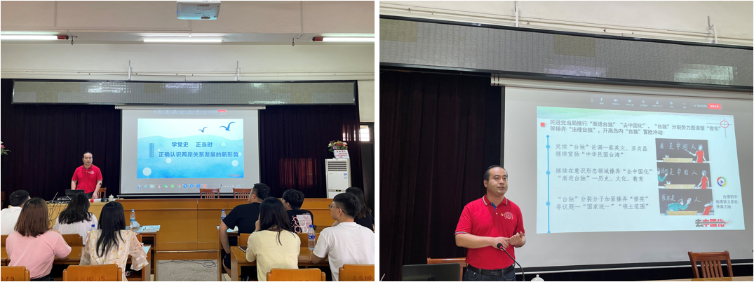 乐无恙以“学党史 正当时—正确认识两岸关系发展的新形势”为主题讲授党课,从中国大陆沉着应对“台独”分裂图谋、两岸命运相连不可分割、推动两岸关系克难前行入手,回顾两岸关系发展史,分析了当前两岸严峻复杂的台海形势,讲清中央对台方针政策,引导青年党员历史、客观、辩证地认识台湾问题和两岸关系发展新形势。