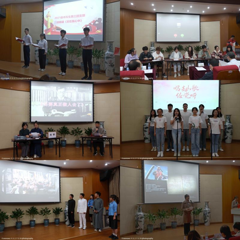 首先登场的是2021级本科生第三团支部,他们带来了声情并茂的诗歌朗诵《党在我心中》,朗诵者们以满腔豪情和热血追寻伟大祖国的足迹,歌颂党史光辉历程,抒发心中对中国共产党和伟大祖国的无比崇敬和热爱,让在场所有人都永远铭记和感谢党的恩情。