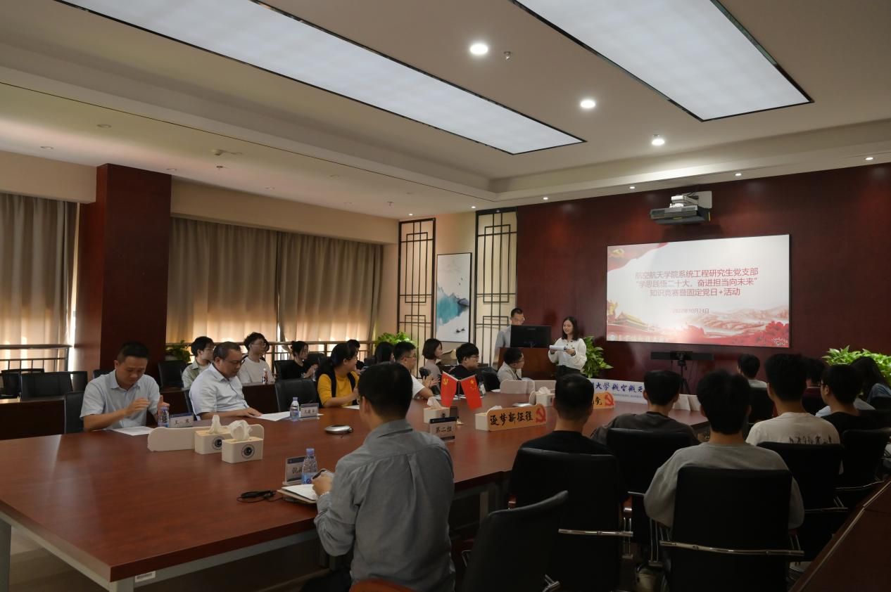 10月24日下午,航空航天学院系统工程研究生党支部于院楼501会议室开展学习党的二十大精神知识竞赛。学院党委书记王康平,党委副书记林蔚、王寒,团委副书记倪建超及系统工程研究生党支部党员参加活动。