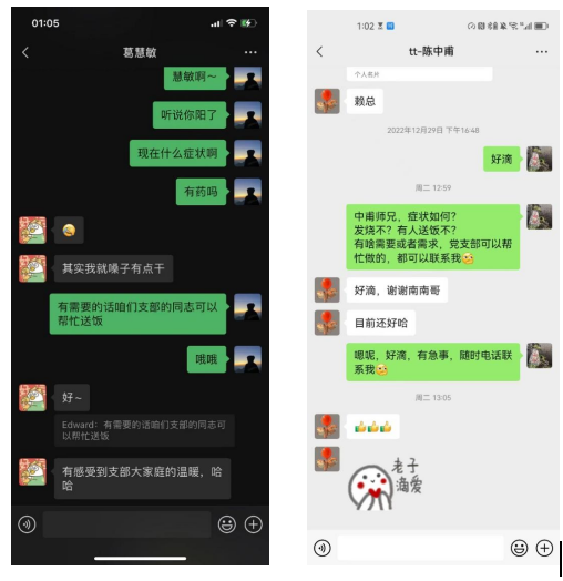 凛冬不寒冷,温暖与互助未曾因为病毒的肆虐而缺席。每当有学生确诊感染,支部负责人从学院团委接到消息后,就会立即通知相关组长与确诊同学取得联系,并在其身体康复前,每天关注其症状,解决生活物资或应急物资的困难,做到不漏一人,不漏一天。有的同学病情比较严重的,组长立即反馈给课题组负责人和学院团委,启动应急预案。