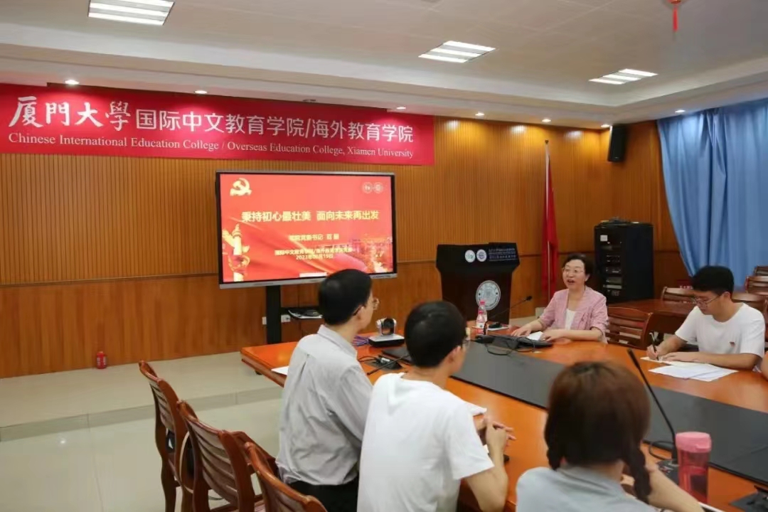 6月19日上午,国际中文教育学院/海外教育学院在翔安校区坤銮楼C104会议室举行2023届毕业生党员教育大会暨专题党课。学院党委书记范丽作《秉持初心最壮美,面向未来再出发》专题报告,为2023届全体毕业生党员和入党积极分子上了一堂生动的学习贯彻习近平新时代中国特色社会主义思想主题教育