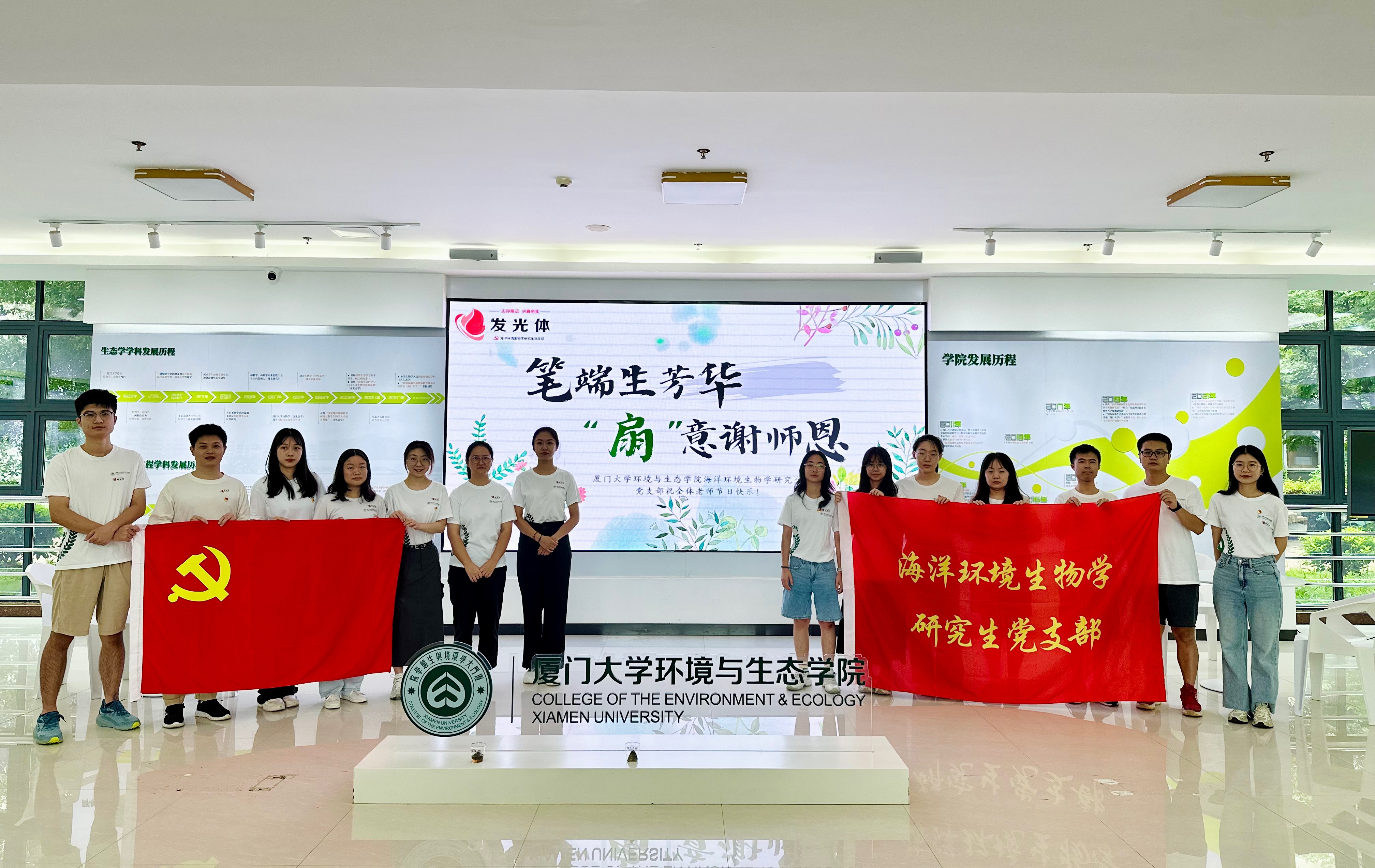 98日,在我国第39个教师节来临之际,为弘扬尊师重教的良好风尚,环境与生态学院海洋环境生物学研究生党支部在学院党委指导下开展“笔端生芳华,‘扇’意谢师恩”主题党日活动,向老师们致以节日的祝贺和诚挚的感激。