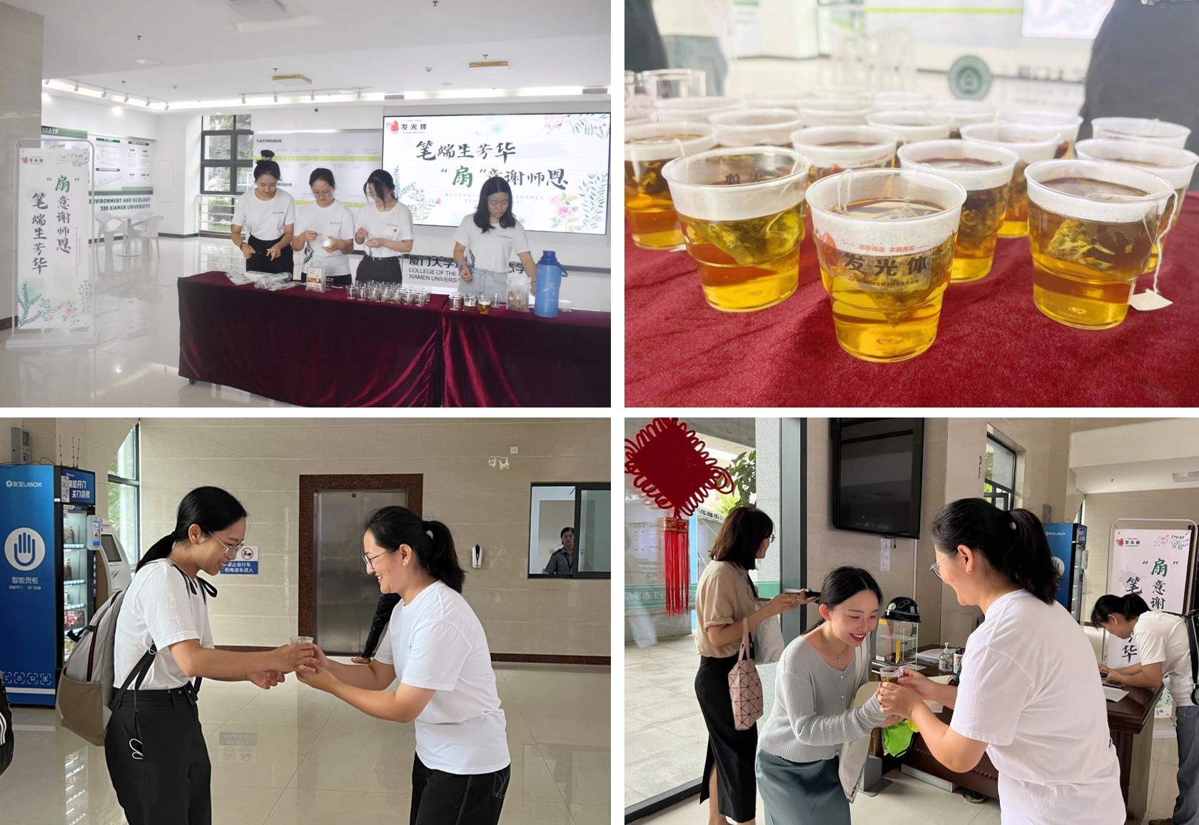 以茶为媒,敬恩师。以茶敬师之礼,自古有之。给老师奉上一杯清茶,既是对中华礼仪的传承,也饱含师生浓浓情意。活动当天,支部成员在金泉楼一楼大厅为老师们奉上一杯敬师茶,一齐向辛勤付出的老师们道一声“老师您辛苦了”,感谢老师们的谆谆教诲。