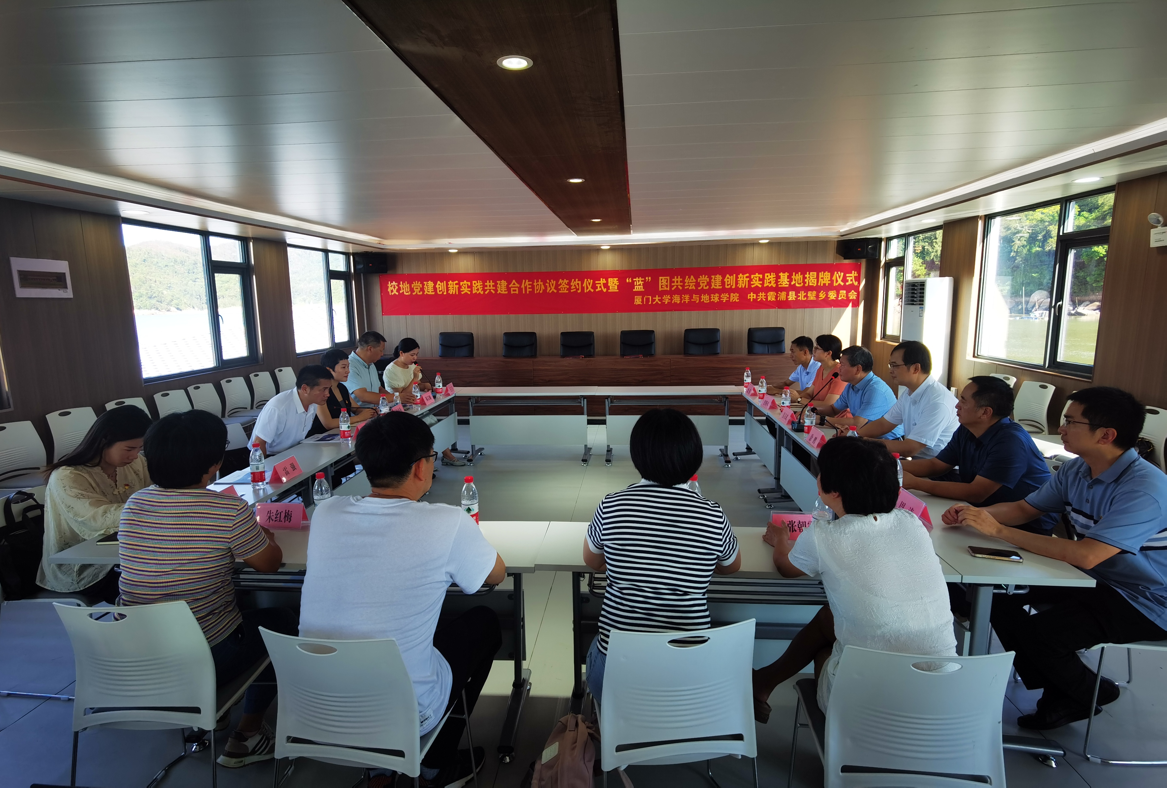 党建引领聚合力,乡村振兴谱新篇。9月19日下午,海洋与地球学院—霞浦县北壁乡共建合作协议签约仪式暨“蓝”图共绘党建创新实践基地揭牌仪式在霞浦县北壁乡东冲村海上社区举行。海洋与地球学院党委书记吴立武、院党委副书记唐腾凤、副院长徐鹏,霞浦县委组织部常务副部长周赟、北壁乡党委书记林彦伶、县海洋与渔业局副局长陈宗顺,海洋与地球学院教授刘涛、正高级工程师毛勇、副教授周涛,海洋生物技术教工党支部、实验教学中心党支部和底栖生物研究生党支部师生党员代表,北壁乡11个行政村党支部书记及北壁乡小学教师等参加仪式。仪式由北壁乡组织委员、宣传委员王云芳主持。