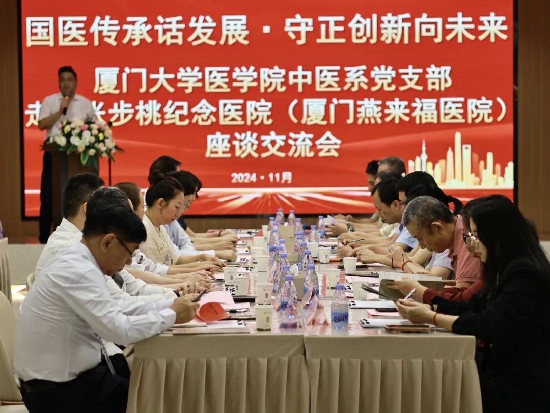国医传承话发展,守正创新向未来。为贯彻落实习近平总书记在福建考察时的重要讲话精神,11月1日下午,医学院党委组织中医系教工党支部的部分教工及台籍学生代表走进张步桃纪念医院(厦门燕来福医院),举行座谈交流会。医学院党委书记李峰、副书记王坤钟,中医系教工党支部书记孙孝忠、组织委员卢大为、宣传委员李曌华,支部党员吕崇山、廖铦、黄淑琼,中医系教师陈则旭,学院辅导员许洋,中医系台籍学生彭群恩、陈谊等参加走访活动。双方开展座谈交流,并举行大学生就业实习基地签约授牌仪式。