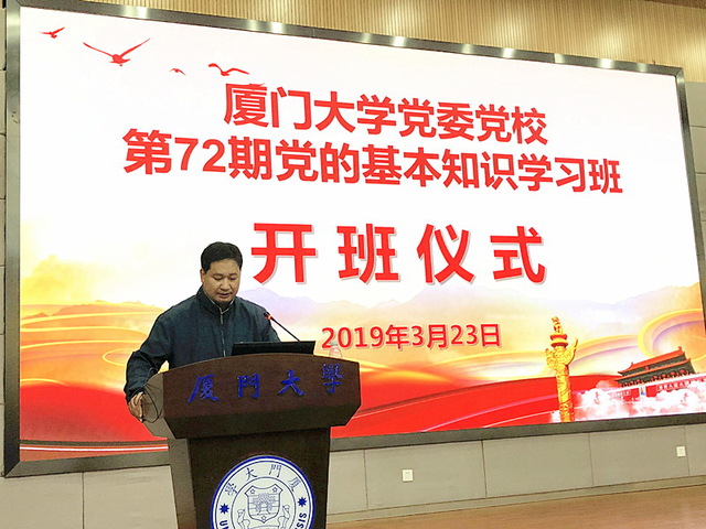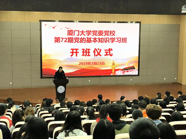 3月23日上午,我校党委党校第72期(学生)党的基本知识学习班开班仪式在翔安校区图书馆2号报告厅举行,来自环境与生态学院、生命科学学院、医学院、药学院、公共卫生学院、能源学院、海外教育学院/国际学院、航空航天学院、海洋与地球学院的250名入党积极分子和各学院带队老师参加了开班仪式,仪式由本期学习班承办单位环境与生态学院辅导员蔡群飞主持。