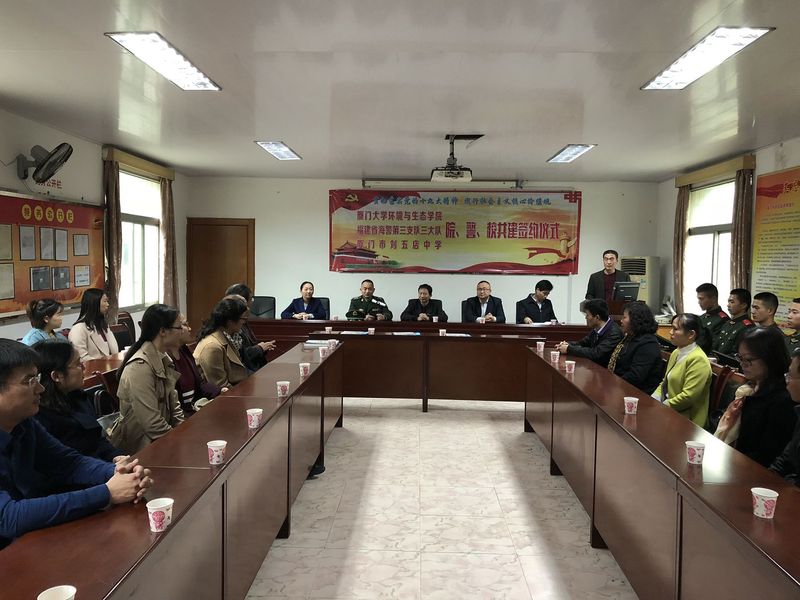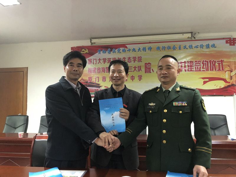 为深入贯彻落实党的十九大精神,响应“生态文明建设”号召,进一步推进海洋环境保护、青少年科技教育创新与党建交流工作,也为大学生实习实践搭建平台,1月4日下午,厦门大学环境与生态学院、福建省海警第三支队三大队、厦门市刘五店中学三方共建协议签订仪式在刘五店中学举行。厦门市翔安区委教育工委书记、局长林佳跃,海警第三支队三大队政委杨平通,环境与生态学院党委副书记周克夫、许美霞,厦门市刘五店中学校长宋火金,以及来自环境与生态学院生态学系教工党支部、实验教学中心教工党支部和厦门大学生态文明学生研习社的师生们,福建省海警第三支队的官兵们、厦门市刘五店中学的师生代表参加了仪式。仪式由刘五店中学朱跃忠副校长主持。