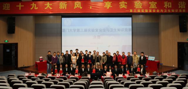 我校第三届实验室安全与卫生知识竞赛决赛于12月14日19:30在德旺图书馆报告厅顺利开展。此次活动邀请了国家级教学名师沈明山教授、张琪河高级工程师、陈晋安高级工程师、海洋环境科学国家实验教学示范中心主任郑爱榕教授及杨士烑教授作为评委。中科院院士、副校长韩家淮教授和实验室与设备管理办公室副主任陈晓兰,学生处副处长、学生办主任张清榕,教务处副处长、教务办主任陈雪芬,校团委副书记,翔安校区团工委书记洪海松以及来自翔安校区各学院的党委副书记、团干辅导员们共同出席了本场比赛。