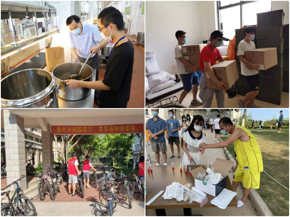 9月23日早餐起,校区食堂全面取消堂食。根据学生线上课程安排,倡导师生错峰用餐;组织志愿者在食堂用餐高峰时段引导有序排队;紧急采购垃圾桶、垃圾袋投放在学生宿舍园区,制作垃圾分类宣传标语,协调市政部门调整校园垃圾转运时间,协调超市紧急采购饭盒供学生购买。