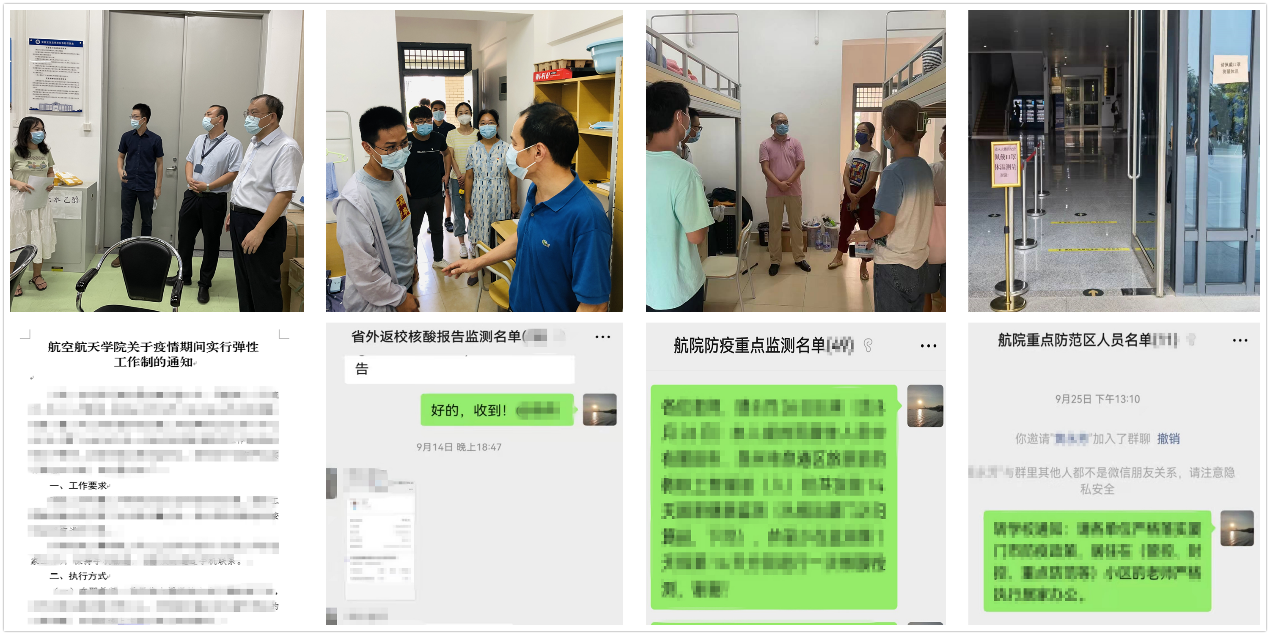 9月中旬,面对疫情防控的严峻形势,学院立即启动疫情防控应急预案,多措并举夯实疫情防控工作。学院党委积极谋划,向学院全体党支部和全体党员发出倡议信,印发《关于进一步发挥航空航天学院基层党组织战斗堡垒和党员先锋模范作用开展2021年“防疫领航”工作方案》,发布致全院师生的一封家书。在学院党委的领导下,学院各项防疫工作紧张有序开展。