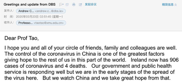3月23日,厦门大学海外合作院校——爱尔兰都柏林商学院院长Andrew Conlan-Trant教授就中国新型冠状病毒肺炎疫情,向我校海外教育学院/国际学院陶涛院长发来邮件问候。