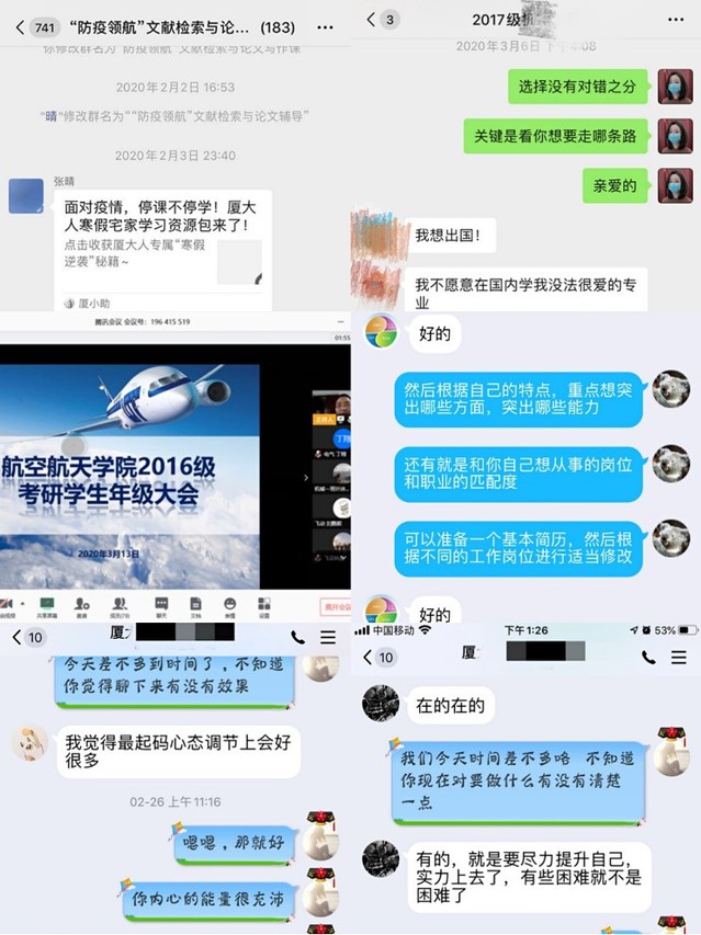 学院开展“防疫领航”就业指导,通过qq群、微信群(覆盖本硕博毕业生517人)和学院官方微信、“厦大航院就业促进中心”等微信公众号进行线上就业指导,每天定时批量推送最新就业信息,共享指导课程和红利政策解读,确保重要信息第一时间覆盖求职群体。