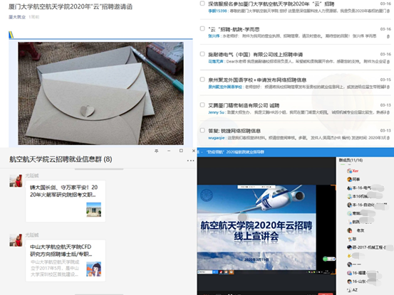 学院向用人单位发布“厦门大学航空航天学院2020年云招聘邀请函”,邀请用人单位开展 “云”招聘,目前已有数十家单位主动联系学院开展招聘工作。营造全员育人环境,学院专任教师、校友协同推进,积极联系推荐就业机会,向合作单位重点推荐优秀毕业生。
