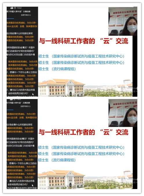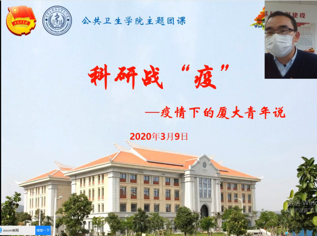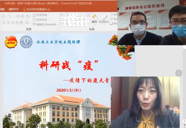 “云”上团课开讲啦!3月9日下午,公共卫生学院通过钉钉网络直播平台,开展“科研战‘役’——疫情下的厦大青年说”主题云团课,邀请奋战在科研一线的三位硕士研究生分享科研攻关背后的故事。校团委副书记、教育研究院文静副教授全程参与指导本次团课学习,团课由学院团委副书记沈鑫主持。