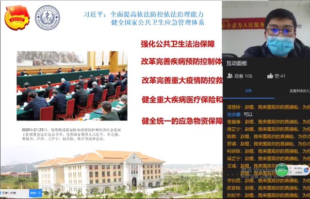 辅导员赵煜带领同学们学习习近平总书记在新冠病毒肺炎疫情期间的重要讲话精神,引导同学们树牢“四个意识”、坚定“四个自信”、 做到“两个维护”,通过疫情防控各项工作正确认识中国共产党领导和中国特色社会主义制度的显著优势。