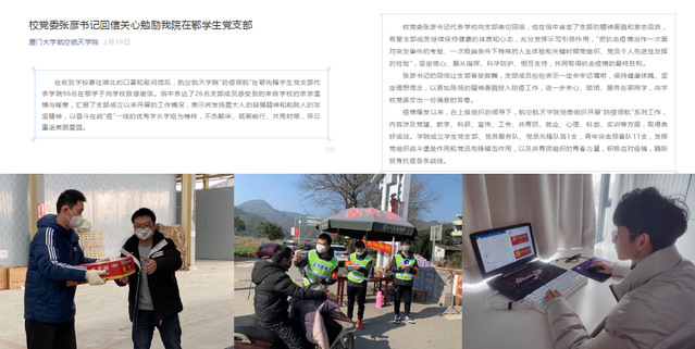 在当前防控新冠肺炎疫情的严峻斗争中,航空航天学院党员师生坚定、执着而美丽的身影不断涌现。全院党组织、党员坚决贯彻习近平总书记重要指示精神和党中央、国务院决策部署,不忘初心、牢记使命,充分发挥战斗堡垒和先锋模范作用,在关键时刻挺身而出、英勇奋斗、扎实工作,团结带领全院师生共同打赢疫情防控阻击战。
