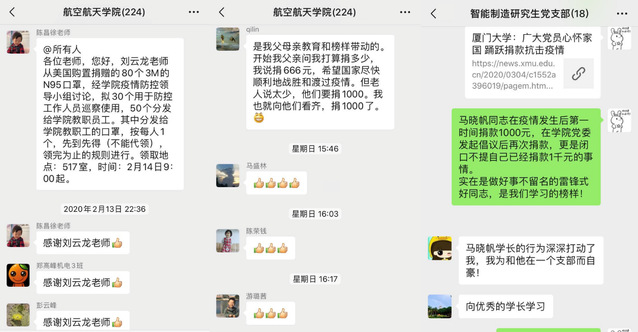在日常防疫工作之外,学院党委还在广大党员师生中积极倡议动员,掀起捐款捐物热潮,学院全体在职教工党员率先完成捐款。正在美国加州大学洛杉矶分校访学的自动化教工党支部副书记刘云龙第一时间辗转美国各地购买N95口罩80个,由爱人带回国内,捐献给学院,受到师生一致点赞。智能制造研究生党支部党员、2019级博士生马晓帆在疫情发生后第一时间捐款1000元,并在学院发起倡议后再次捐款。退休党员教师林麒和她的父母,三名老党员一道捐款3000元。她的父母也是老厦大人,解放初就加入中国共产党。当看到以习近平同志为核心的党中央带头为新冠肺炎疫情防控工作捐款,毫不犹豫响应学校募捐倡议积极捐款,他们说,“听党话、跟党走,是我们这一代共产党员的信仰和追求。”