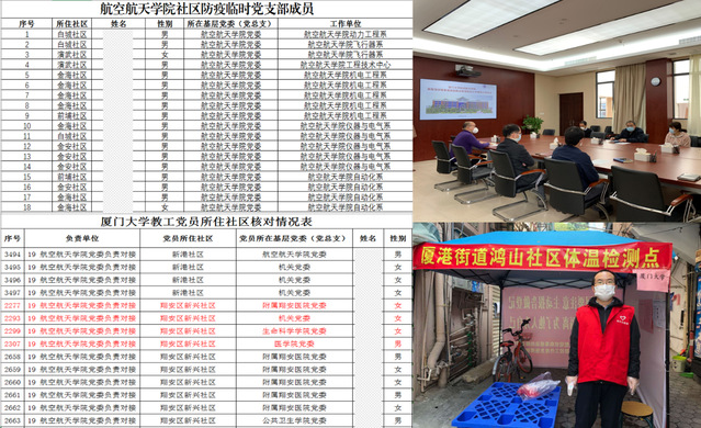 在学院党委的组织号召下,教工党员以战“疫”践行初心使命,纷纷戴上党徽、穿上马甲,前往所在社区承担防疫任务,参与党员覆盖7个教工党支部。仪器与电气教工党支部副书记何良宗、机电工程教工党支部副书记赵扬带领支部10名党员参与社区防疫工作。工程技术教工党支部宣传委员刘万山在阴雨降温且没有帐篷遮挡的情况下坚持在岗服务,获得了演武社区和居民的好评。动力工程教工党支部书记黄玥、飞行器教工党支部宣传委员朱呈祥、自动化教工党支部党员邵桂芳等在社区服务的同时,与工作人员进行沟通交流,缓解其长期在岗的身心压力。刚刚成为正式党员的仪器与电气教工党支部王昕主动报名参与金安社区防疫工作,与学校其他单位的11名老师一道处理完成8000多条住户信息。行政教工党支部蔡鹏程、范林溪、贾君、王坤等党员分别在学校食堂、校车站点等地进行体温测量工作,身体力行筑好坚强防线、守护平安校园。