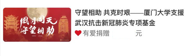 一项爱心捐款。“充吾爱于无疆”,在“校主”嘉庚先生的精神感召下,学院积极响应学校募捐倡议,动员全院为在湖北地区的渴盼支援的人们送去一份爱心,贡献一份力量,以实际行动表达对奋战在抗击疫情第一线的医务工作者的崇高敬意,表达对疫区人民的支持和鼓励,用涓涓细流汇成奉献社会的浩浩江河。