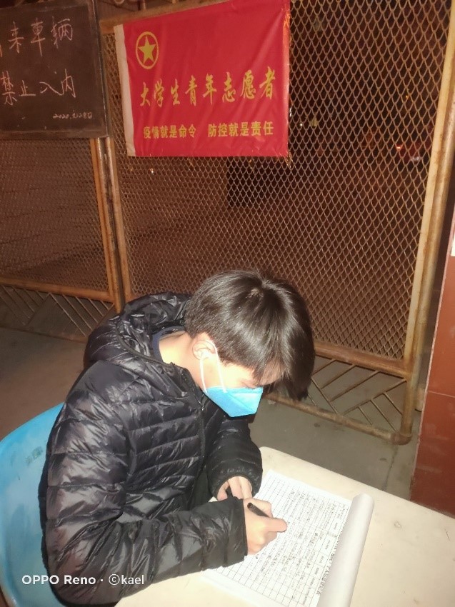 共青团员王润泽,厦门大学航空航天学院2019级本科生,来自甘肃省武威市民勤县。疫情暴发后,为把疫情给人们带来的威胁降到最小,民勤县采取了限制居民外出的策略。同样加入疫情防控大学生青年志愿者团体的他,每天下午四点到晚上八点,都会去指定地点值班,根据每户人家都持有街道办审核通过的居民健康证对进出人员信息进行核对,对去向和接触人员进行登记。在他和所有志愿者的共同努力、居民的积极配合下,全县做到了0疑似、0确诊。提及这次志愿者服务,他说:“疫情就是命令,防控就是责任。只要每一个人都积极站出来,共同面对,严防严控,献出自己的一份力,无论多大的困难都会被克服,再肆虐的疫情都会被控制住。”