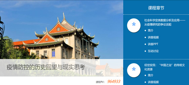 此项专题计划录制15个讲座,按照进度安排,从2月开始,基本上每日完成1-2个讲座录制工作,目前已完成《疫情影响下中国旅游经济恢复与运行》《朱熹的“格物致知”与涵养工夫》《Human Origins and Expansion》《经世安民:中国之治的传统文化资源》《社会科学定类数据分析及应用-从疫情研究的争议谈起》等5个讲座的录制工作,并正在陆续制作上线中。