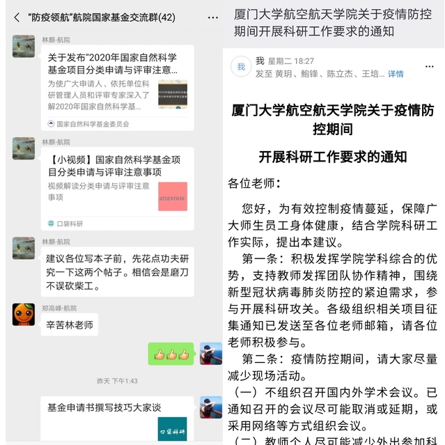 学院组建由11位专家组成的国家自然科学基金申报专家组,对学院教工申请基金项目提供线上辅导答疑,目前已有42位教工加入基金交流群。该群及时传达国家基金委、学校科技处等业务主管部门的最新通知与资讯,教师党员尤延铖常务副院长、林麒教授等上线分享申报经验。结合学院科研工作实际特点,学院向全院教工发送了“关于疫情防控期间开展科研工作要求的通知”,为疫情防控期间做好科研工作提供规范守则。